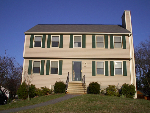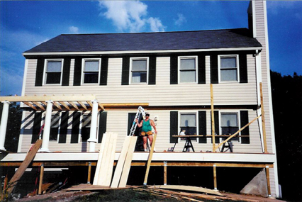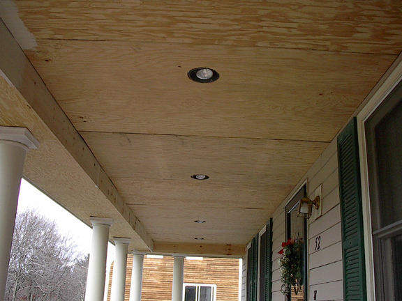 October 18, 2002 The roof, trim, siding, and gutters are finished, the trim on the bottom has been painted, and the recessed lighting has been installed. |