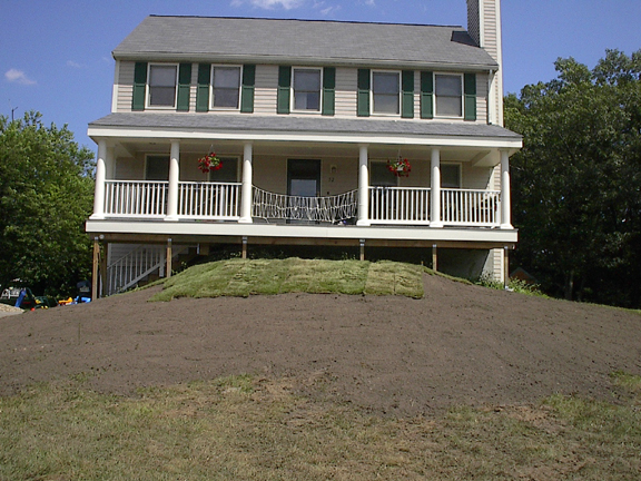 July 12, 2003 The front of the lawn has been re-graded so that the front steps have a flat section to land on. The sod is partially installed.